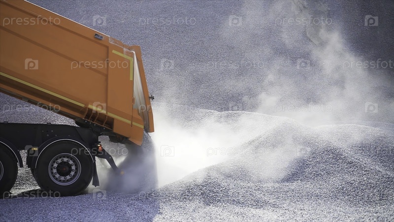 Дампер на строительной площадке разливает мусор среди груды камней
