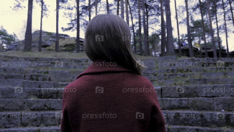 Сзади изображение девушки в красном, стоящей в лесу.Хипстерская девочка в коричневом платье, которая стоит одна в лесу, возвращается к камере.Девушка с рыжими волосами в лесе
