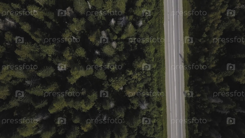 Вид с воздуха на сельскую дорогу через зеленый лес в летнее время. Стрельба. Автомобиль приближается. Высокоугольный вид дороги, проходящей по лесу при закате солнца со пространством для авторских прав. Вид сверху асфальтированная дорога проходит через по