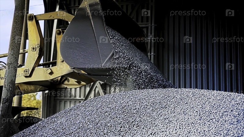 Профессиональная машина с ветром полностью загружена, заполняя металлический ангар маленькими измельченными камнями