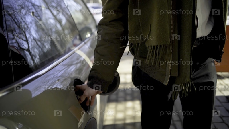 Мужчина вставляет шланг в машину автозаправки. Продолжайте. Человек нервно и быстро заправляет автомобиль на заправочной станции. Заправка автомобиля во время длительной погони