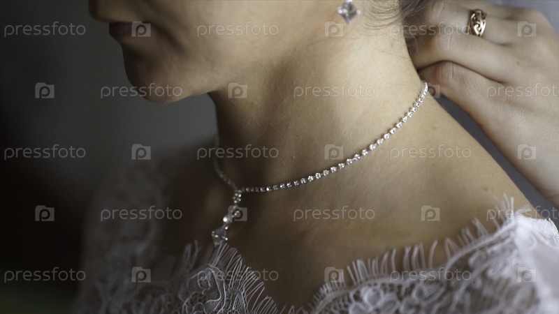 Браслет и ожерелье. Женщина пробует на себе браслет с ювелирными украшениями. Невеста сокровищами. Женщина с драгоценностями. Девушка с модными украшениями, серьгами, браслетами и ожерельями