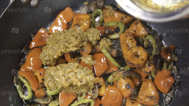Приготовление жареных овощей в ваке. Клип. Кулинарные картофель фри нарезанный белый лук. Нарезанный на сковороде. Возвышающийся из кастрюли с жареным луком. Овощи жарить в горшке