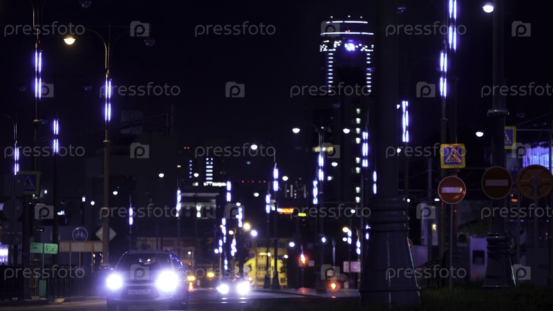 Красочный свет в центре города и дорога с движущимися автомобилями, концепция ночной жизни