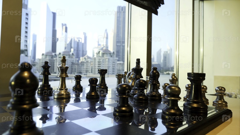 Черно-золотые шахматы подходят к городскому ландшафту на фоне небоскреба.Стратегическое формирование бизнеса в шахматной игре с городским фоном
