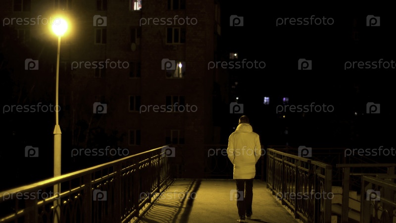 Пешеходный мост с одиноким уличным фонарем и мужчиной, пересекающим его ночью. резервные кадры. задний вид молодого человека в белом пиджаке, переходящего мостик в городе ночью