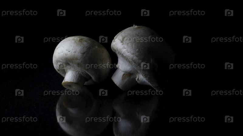 Грибы на черном фоне. Рамка. Два гриба, выделенные на чёрном отражающем фоне