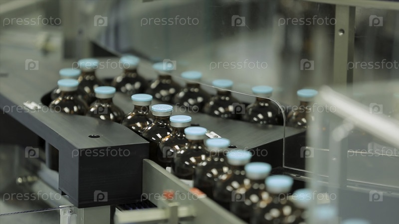 Фармацевтическая промышленность. Производственная линия машинного конвейера на фабрике с бутылками. фармацевтическое производство жидких лекарственных препаратов