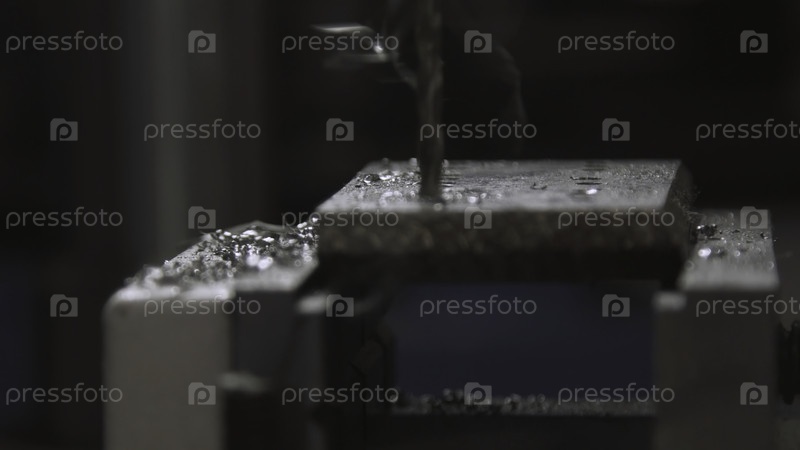 Бурная машина, CNC-машина. Закройте руки робота в процессе фрезирования и бурения металлообработки, металлической обработки, металлообработки. Оборудование для обработки металлов на современной фабрике