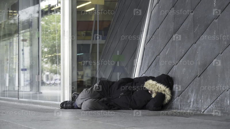 Бездомный мужчина в теплой одежде спит на улице возле входа в здание, это понятие бедности.Бедный безработный бродяга лежит рядом с бетонной стеной