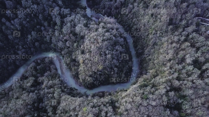 Вид сверху на извилистую реку и гору. Заткнись. Вид на красивую горную реку и прекрасный лес. Аэрофотосъемка. Панорама пейзажа: полет над горной рекой