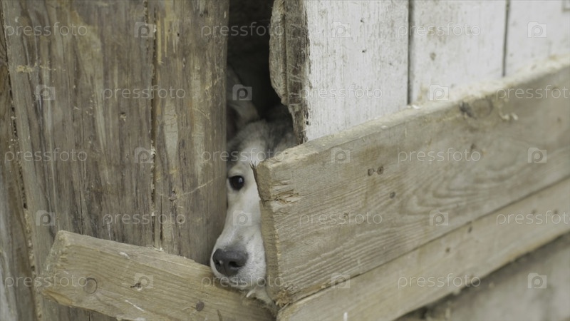 Две собаки смотрят через деревянный забор. видео. две охотничьи собаки стоят у забора в деревне. две собаки в клетке