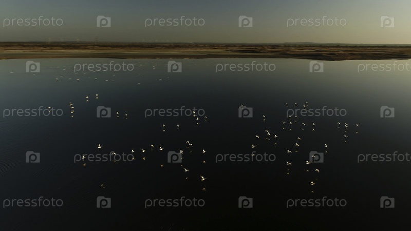 Силуетированное стадо диких уток парит над темно-синей водой на фоне яркого солнца и голубого неба