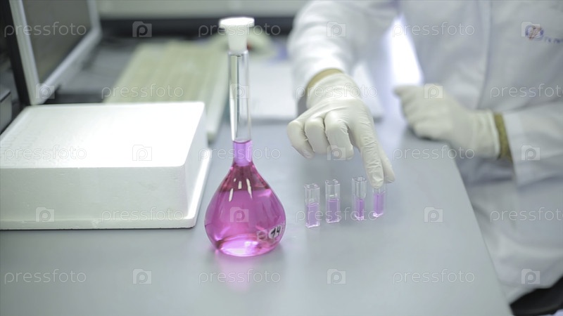 Молодая женщина-лабораторный техник изучает коническую стеклянную колбу Эрленмайера, заполненную зеленым жидким раствором во время проведения химических тестов. Работница лаборатории осматривает колбу с реагентом. Юная студентка-химик проводит научные исс