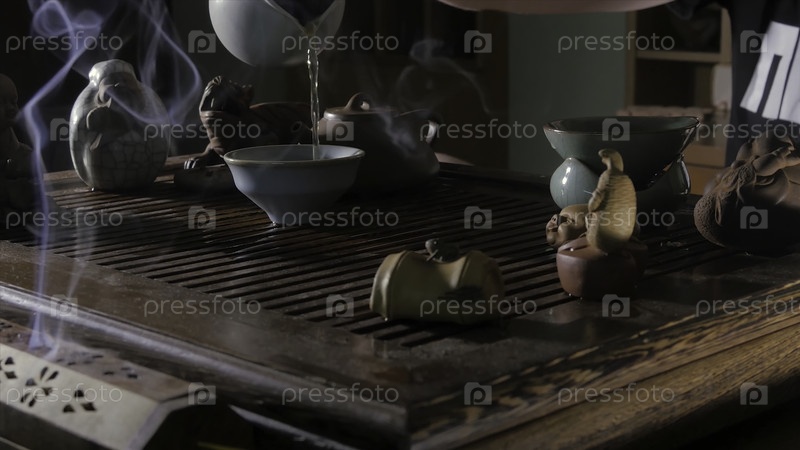 Традиционная китайская чайная церемония и налив чая в стакан из глины. Налей горячую воду ведрой. ХД-церемония
