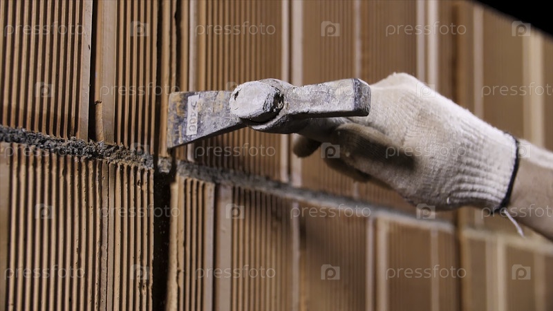 Закройте рабочего, держащего металлический молот и пробивающего отверстие внутри красной керамической стены блока. резервные кадры. этап строительства нового здания