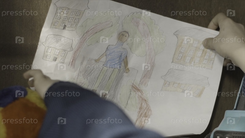 Ребёнок ставит картину на полку с видом назад.Ребенок вешает картинку на стену.Взгляд назад мальчика повесил картинку на стене