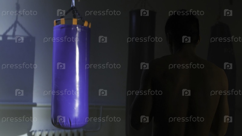 Задний вид мускулистого мужского боксера, бьющего сумку в комнате для бокса.Боец наносит серийное ударение с перекрестным крючком во время работы руками в боксерских перчатках.Спортсмен приближается к сумке и начинает ее пинать