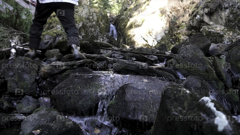 Сзади мужчина в шляпе и белом куртке, путешествующий по горам возле небольшого красивого водопада