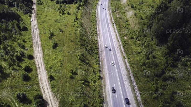 Вид с воздуха летних зеленых деревьев, рек, дорог на фоне леса. Вид с воздуха изогнутой тропы в горах. Вид из воздуха автомобилей, едущих по сельской дороге в лесу. Вид с воздуха пролетел над старой заправленной двухполосной лесной дорогой с