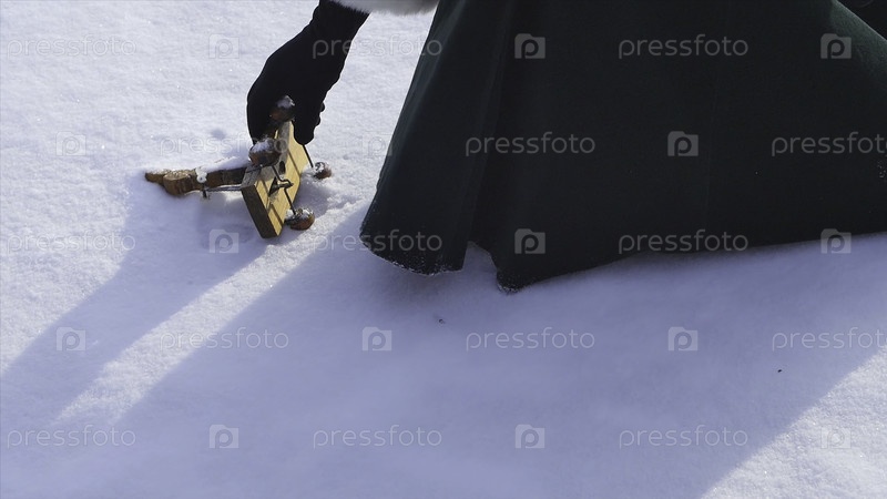 Детская игрушка лежит в снегу, и женщина берет ее.Маленькая игрушка в снеге.Ретро Цветная коробка Зимний снег - это винтаж на белом карандаше.Зима