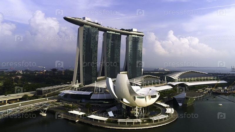 Сингапурский городской пейзаж с красивой рекой и знаменитым пляжем Марина-Бэй Сэндс с Музеем искусства и науки. потрясающий вид на центр Сингапура и залив Марины на фоне синего неба