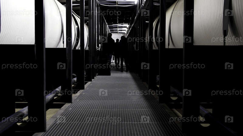 Задний вид трех мужчин, идущих вдоль резервуаров для очистки воды на электростанции