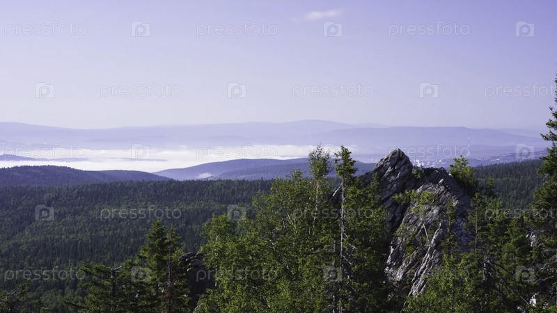 Осенний пейзаж с красочными лесами. Голубое небо. Голубая гора с голубым небом и облачной горой