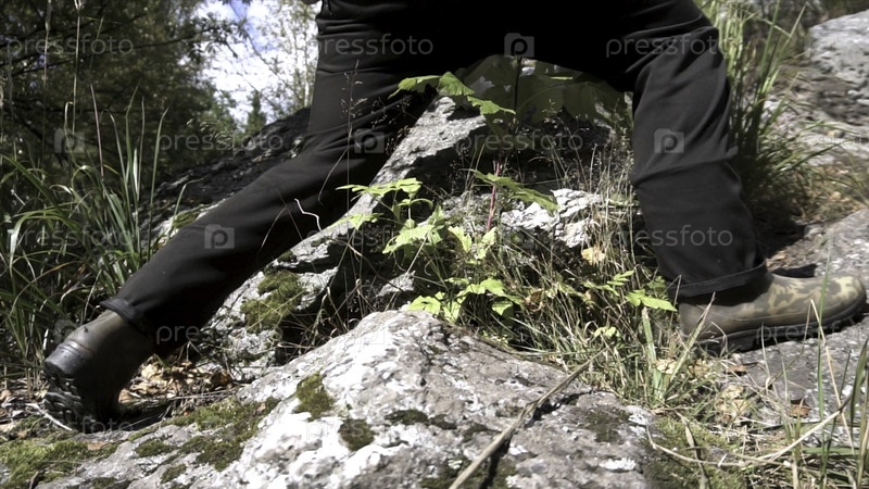 Человек делает шаги, чтобы подняться на гору в солнечный день