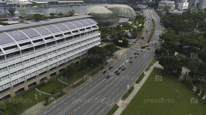 Сингапур - 25 сентября 2018: Городской горизонт Сингапура вдоль реки Сингапур, красивая зеленая трава и дорога