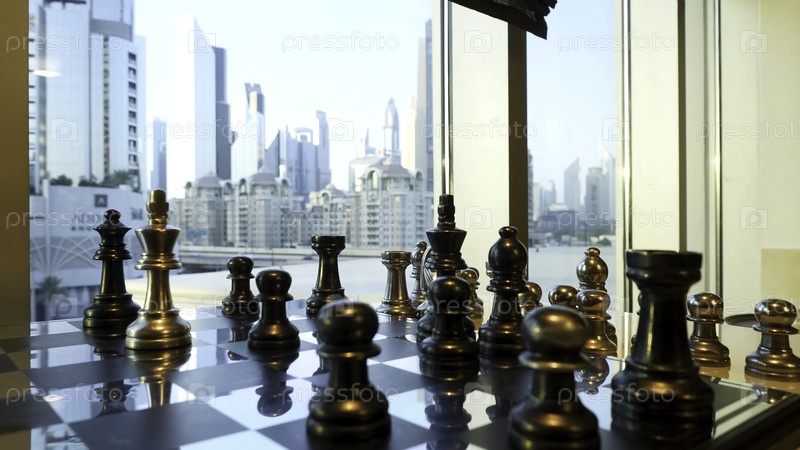 Черно-золотые шахматы подходят к городскому ландшафту на фоне небоскреба.Стратегическое формирование бизнеса в шахматной игре с городским фоном