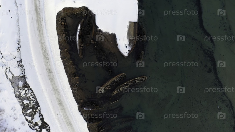 Вид на многие старые кораблекрушения, которые затонули в море во время снежного зимнего сезона