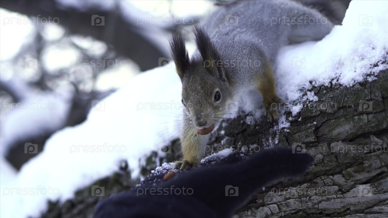 Покрывайте серую белку, тщательно берущую орех из человеческой руки на снежной ветви дерева зимой. белка сидит на снежной ветке дерева и ест арахис из рук в черной перчатке в зимнем парке