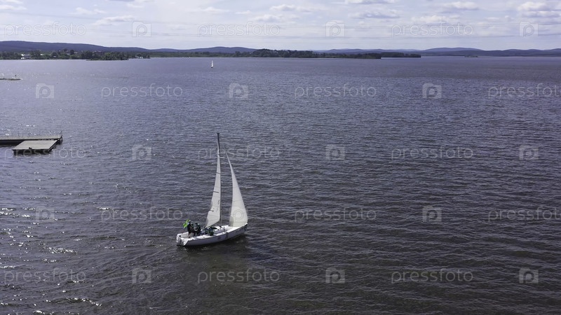 Вид на парусную яхту, уходящую с берега. Видео. Яхта с белыми парусами отплывает с пирса и направляется к горизонту. Морские виды спорта на парусных яхте