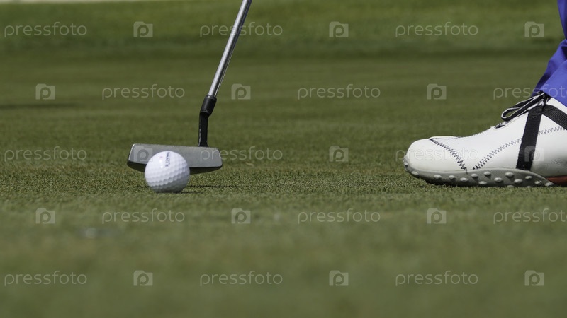 Профессиональный гольф-игрок бросает мяч в отверстие. мяч для гольфа по краю дыры с игроком на заднем плане в солнечный день