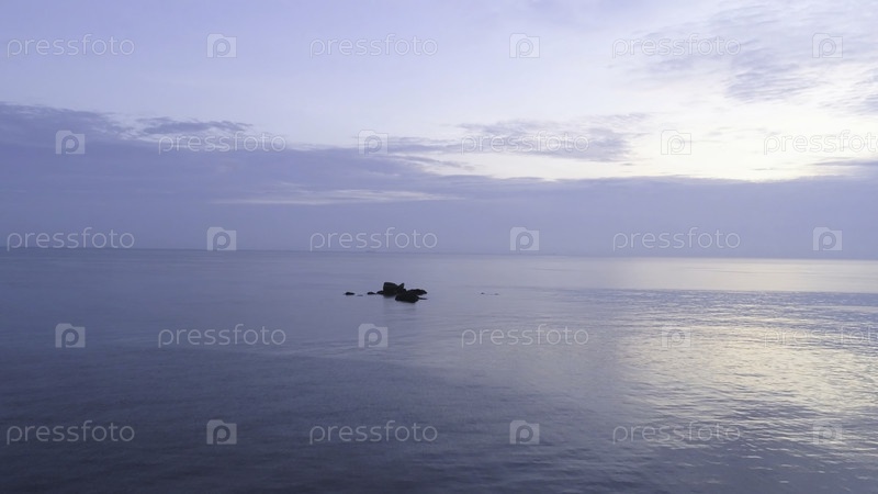 Морской пейзаж с небольшими скалами, выходящими из воды и красивым голубым облачным небом. Съемки. Романтическая атмосфера в спокойном закате на море