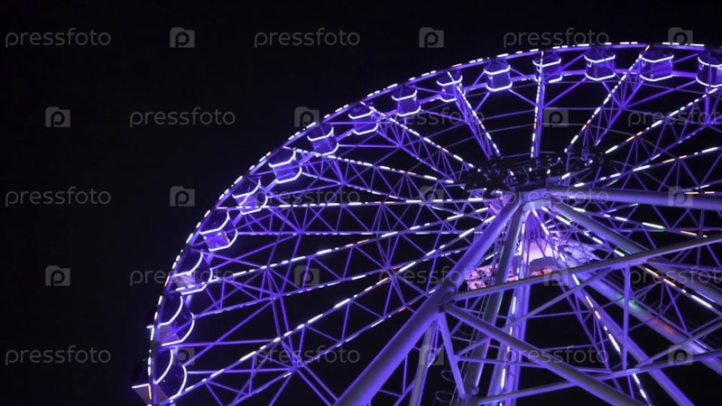 Колесо обозрения в синем неоновом свете на темном фоне, часть колеса обозрения с голубым освещением на черном фоне ночного неба