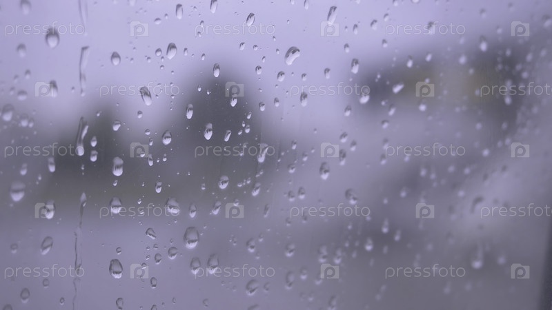 Стекло мокрое, капли дождя на влажном стекле окна, осенний дождливый пейзаж размыт