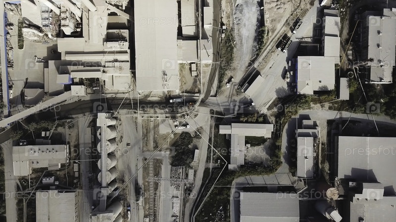 Вид сверху на здания и склад материалов в промышленной городской зоне. Резервные кадры. Многие крыши зданий, фабрик и складов в городской индустриальной зоне