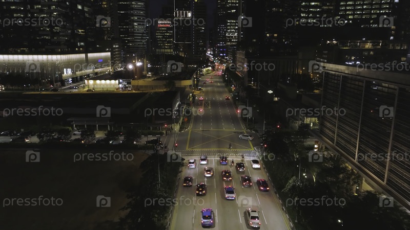Вид на улицу с автомобилями и современными зданиями в крупном китайском городе ночью.Стрельба.Ночной вид из воздуха на центр города со своей дорогой, движущимися машинами, огнями небоскребов, концепцией ночной жизни