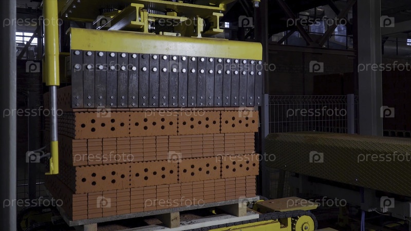 Завод по производству строительного материала с готовым кирпичом, промышленное строительство. Производство кирпичей на фабрике. Рабочий процесс, крупный план. Многие кирпичи