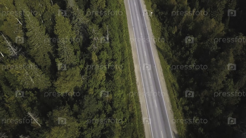 Вид с воздуха на сельскую дорогу через зеленый лес в летнее время. Стрельба. Автомобиль приближается. Высокоугольный вид дороги, проходящей по лесу при закате солнца со пространством для авторских прав. Вид сверху асфальтированная дорога проходит через по