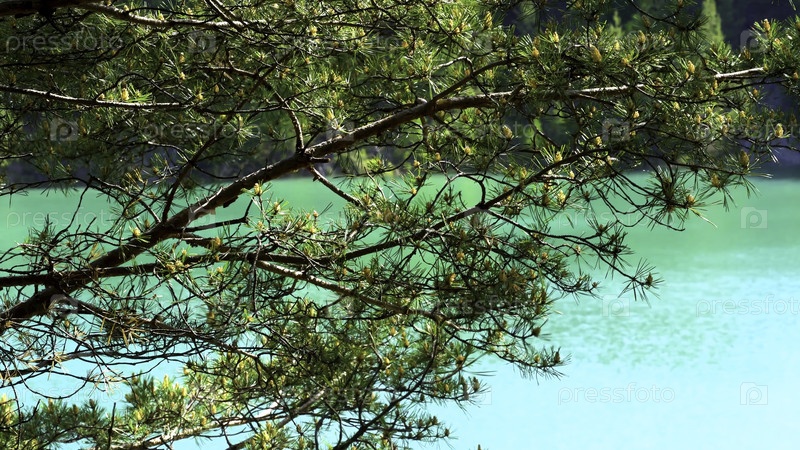 Сосновые ветви раскачиваются в ветре на зрелищном бирюзовом озере или речном фоне. резервные кадры. яркий пейзаж с хвойными деревьями со сосны перед голубой водой