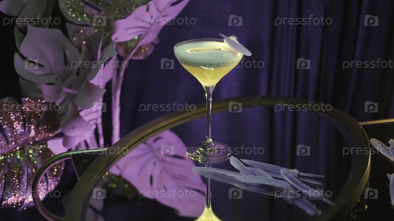 Коктейль, украшенный перьями в ресторане. резервные кадры. Закройте алкогольный напиток в стакане мартини, стоя на столе в фиолетовом помещении с искусственными цветами на заднем плане
