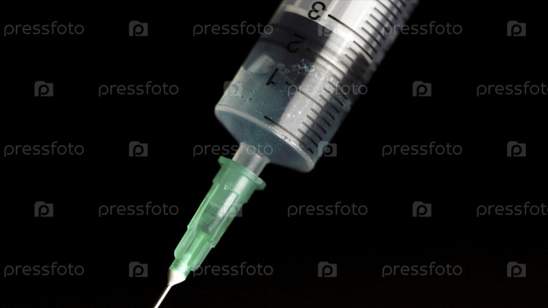 Вакцинация в стеклянном шприце из ампулы на черном фоне. Закройте. Шприц забирается в бирюзовую жидкость для инъекции от болезней серьезных заболеваний, концепция медицины