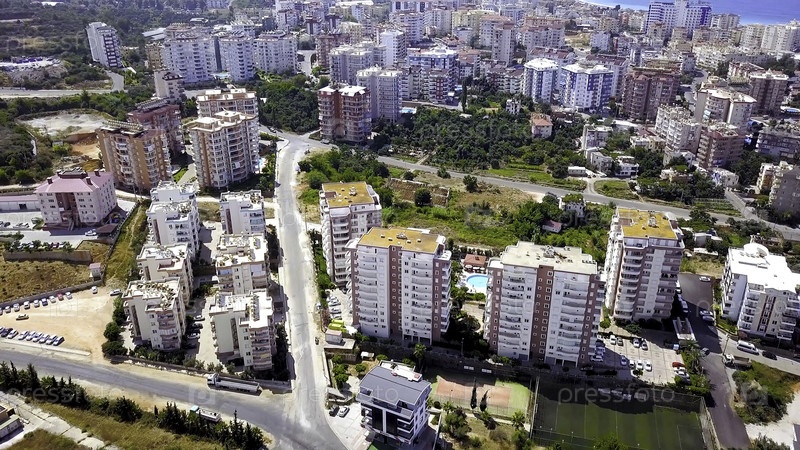 Вид на курортный город с отелями и многоквартирными зданиями.Красивые многоэтажные дома с красивым внешним видом курортного города летом