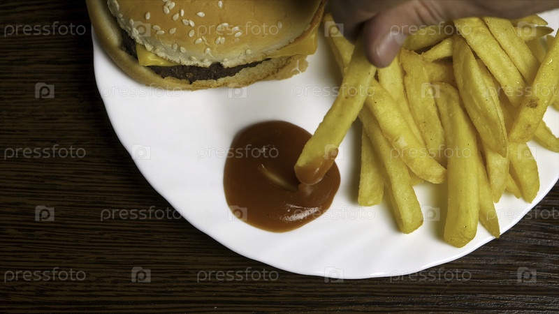 Свежий домашний гамбургер с черными семенами кунжута в белой тарелке с картофелем фри, подаваемый со кетчупным соусом в стеклянной банке на серых деревянных поверхностях