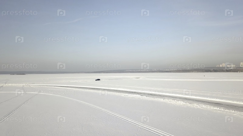 Вид с воздуха вождения по заснеженной дороге. Один автомобиль едет через зимний лес на сельской дороге. вид сверху из дрона