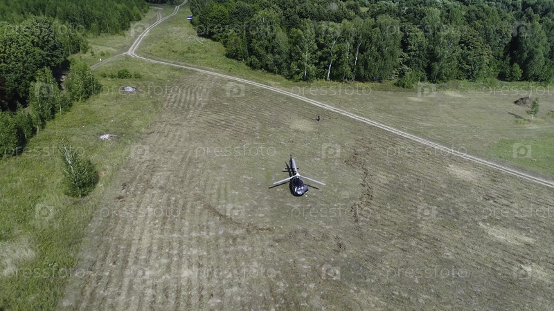 Вертолет приземлился в Грин-Филде.Вертолет сел на желтую траву, облачный день.Летающий дрон и пшеничное поле