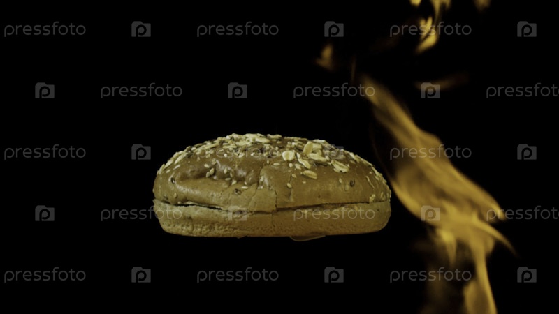 Закрытие вращающегося бутерброда гамбургера на огне, изолированном от черного фона. резервные кадры. вкусная свежая булочка с огнем во время процесса выпечки, концепция еды и кулинарии
